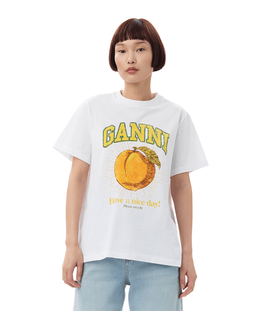 This Relaxed Peach T-shirt is made from organic cotton. The t-shirt is designed for a relaxed fit and features a round neckline, short sleeves and a graphic GANNI print.