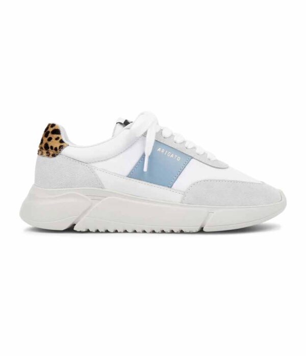 Taking us back to the 80’s, the Axel Arigato Genesis sneaker is inspired by vintage running silhouettes and is the brands most lightweight design. These minimalist, retro inspired trainers are crafted with white and pale blue leather fused with a calf hair back tab in leopard print. Upper parts and lining made are crafted from recycled PET bottles and recycled plastic waste. These lightweight sneakers have an expanded sole and durable design making the Genesis a sustainable footwear choice for the future.