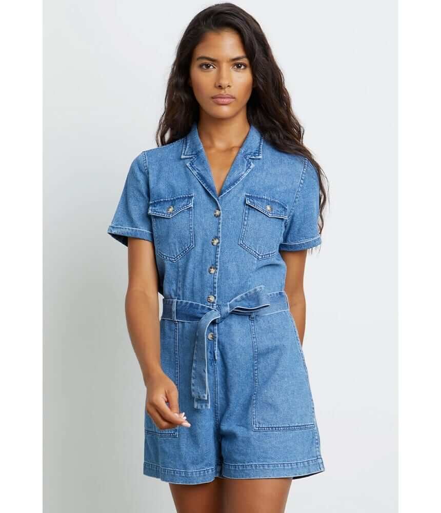 The Rails Georgie Playsuit is a flattering throw on and go piece for an easy one-and-done look. Cut in a gorgeous Cotton/Rayon blend cloth to provide maximum wearer comfort in a vintage wash. Georgie features a lapel collared neckline, cute cinchable tie belt waistline and handy multiple pockets. Keep your look casual, yet polished in this lightweight, transitional denim romper.
