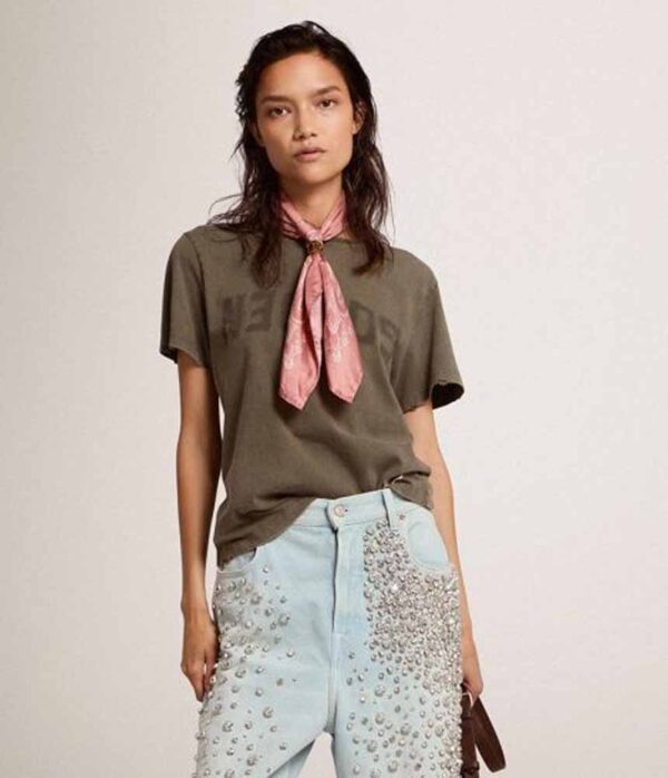 This regular-fit T-shirt in olive-green cotton with a distressed treatment features the Golden logo produced with a resist treatment and a detachable white patch with a finely embroidered letter G in red. We would style with washed down denim and a statement boot for an effortless look.