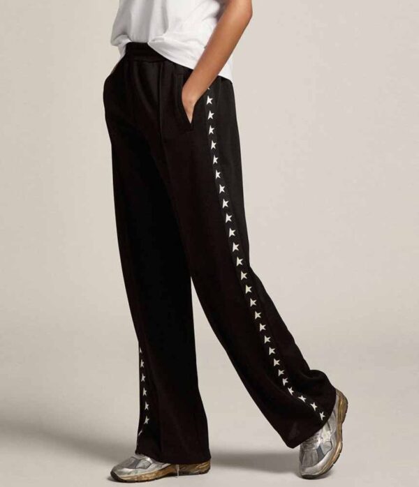 The Dorotea Joggers are Inspired by the world of tailoring, echoed by the stitched pleat on the front, These jogging pants are crafted in black textured fabrication and feature a wide leg with tone-on-tone grosgrain strip down the sides with contrasting white stars to add the finishing touch.