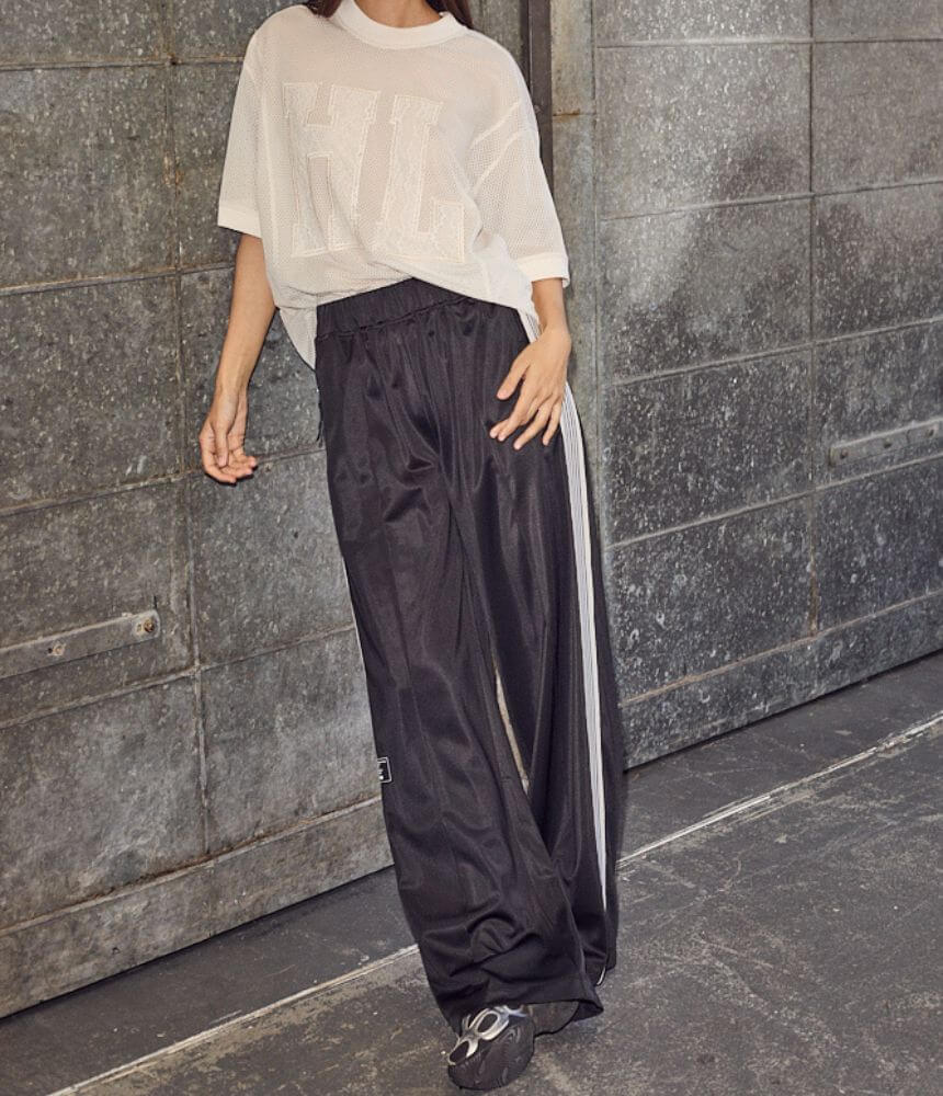 Black track pants from Haute L’Amitié with wide legs and side stripes. The pants have an elasticated waist and decorative stitching for a sporty look.