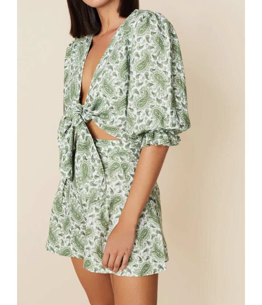 The Jacinta top in 70’s inspired paisley print is a Summer staple which features voluminous puff sleeves, a plunge neckline and a centre-front knot detail. This top is styled perfectly with the matching Ondine Shorts or can be worn as a standalone piece with your favourite trousers, denim or skirt.