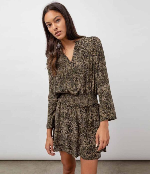 The Rails Jasmine Dress is an ultra lightweight mini dress cut in a luxurious satin crepe fabrication with an olive green and brown base featuring black abstract tiger design throughout This pullover style dress has a comfortable elastic waistline and flowy skirt making for easy wearability with a feminine touch.