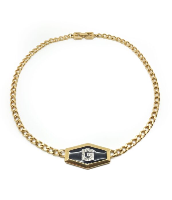 The perfect piece of Vintage Givenchy jewellery from 1979 that totally rocks in the 21st century working effortlessly with today’s wardrobe. Crafted from high carat gold plated metal, the necklace features a gold & black enamel lozenge shaped pendant at the centre of the flattened curb chain. To top it all, the necklace is finished with a rhinestone set G and a double G clasp. Measuring approx. 38.5cm and signed Givenchy and 1979 on the reverse, this necklace is in very good vintage condition without damage or repair. Pure Givenchy magic with this one of a kind piece.
