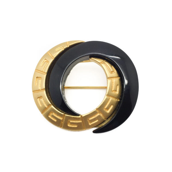 A very stylish Vintage Givenchy brooch dating to the 1980s-90s. Circles of high carat gold gilded metal and black enamel neatly entwine incorporating the iconic Givenchy Logo. Measuring approx. 4cm by 3.3cm, signed Givenchy on the reverse and in very good vintage condition without damage or repair. This piece stands out as an incredibly wearable and chic piece of vintage couture fashion jewellery.