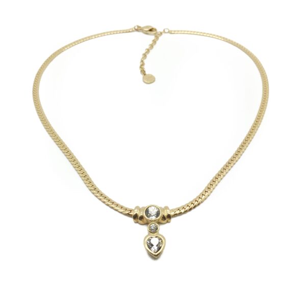 A perfect vintage necklace for layering or to make a delicate statement. Grosse were the main manufacturer of Christian Dior Costume Jewellery from the 1950s such was the quality of their work. This Grosse vintage necklace from the 1990s is no exception and crafted from hight carat gold plated metal with Swarovski crystals. The flattened snake style chain drops down to reveal a delightful crystal set heart pendant. Measuring approx. 40 to 44cm (with extender) long, the necklace is signed Grosse on the hangtag and is in very good vintage condition without damage or repair. A delightfully elegant en trend piece of Vintage Grosse Jewellery.