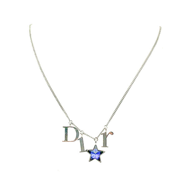 A cool and sassy Vintage Christian Dior spell out charm necklace with electric blue star. Crafted in silver tone metal with blue crystal. In very good vintage condition. A perfect piece from Dior.