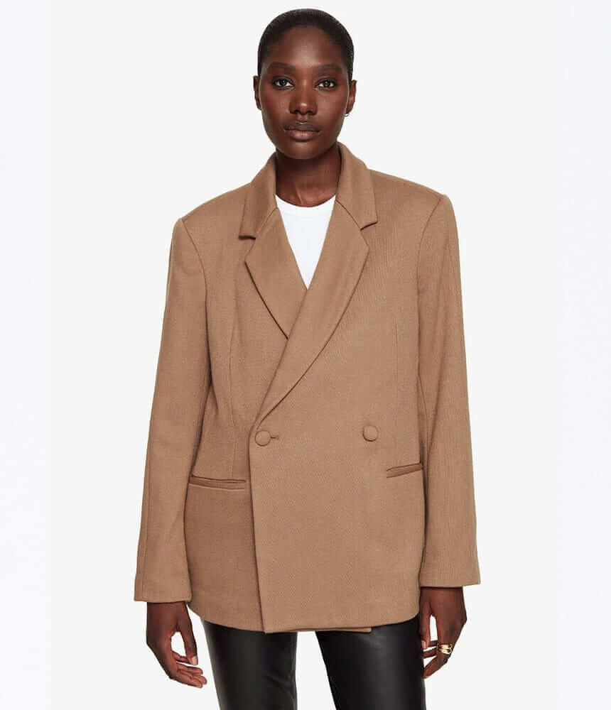 Introducing the Kaia Blazer from Anine Bing, A timeless blazer with a double-breasted closure cut for a true oversized fit. Crafted in a camel wool blend that is neutral enough to pair with everything. Dress up your jeans or go all out tailored by adding a slim suit trouser. The options are endless.