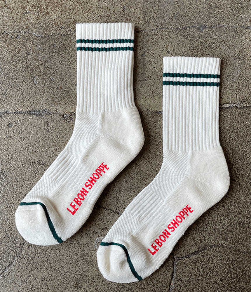 The Boyfriend Sock is the perfect mix of function and fashion creating an effortless sporty vintage charm to any outfit. Slightly longer than a classic crew and has a contrast double stripe. Durable and comfortable, this sock upgrades any outfit. One of our go-to pairings well-worn denim and trainers. We are obsessed!