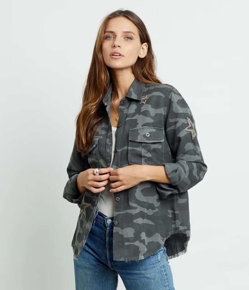 The Loren Shirt by Rails is a lightweight, vintage twill piece with long sleeves, flap chest pockets and a metal button fastened front. Cut in a super-soft Tencel mix fabric with a grey camouflage pattern and adorned with metallic gold star embroidery detail. We would style this stunner of a shirt with vintage denim and a chunky ankle boot to channel your inner soldier.