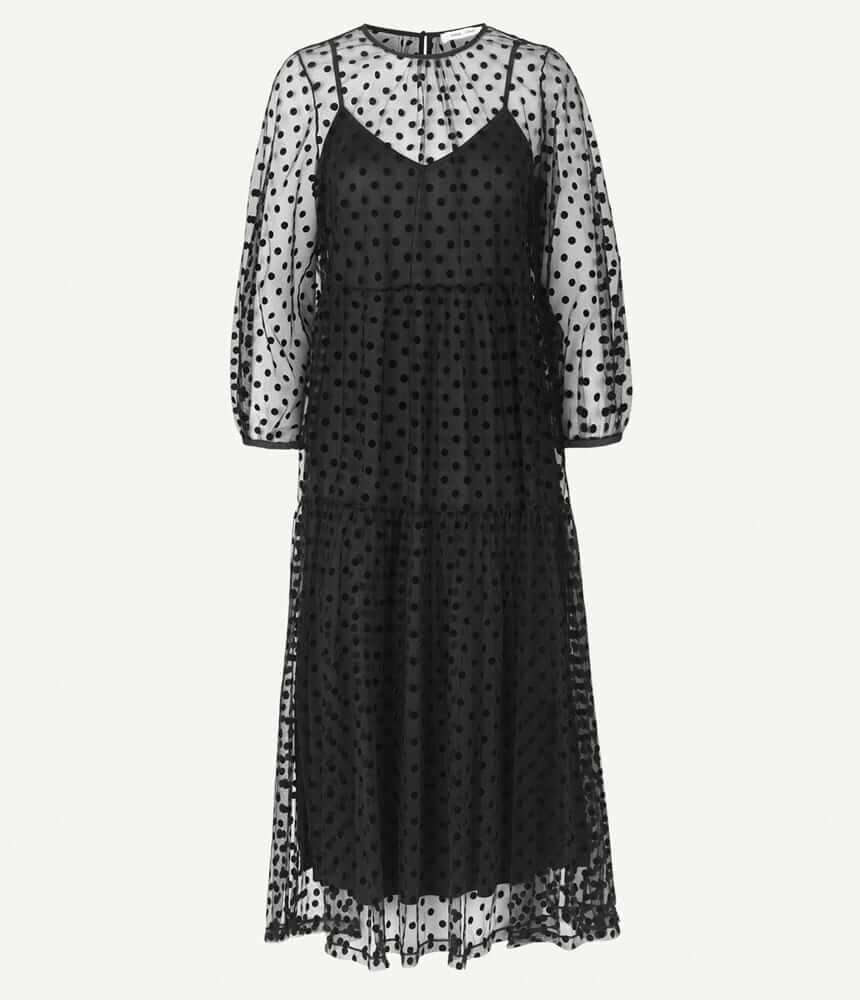 The Madie Dress by uber-cool Scandi brand Samsoe Samsoe takes their brand ethos to another level. Cut to a stunningly simple silhouette, this loose fitting midi dress with three-quarter length sleeves, tiered skirt and a round neckline with button fastened keyhole back neck is crafted from a deliciously sheer dotted fabric. Simply stunning!