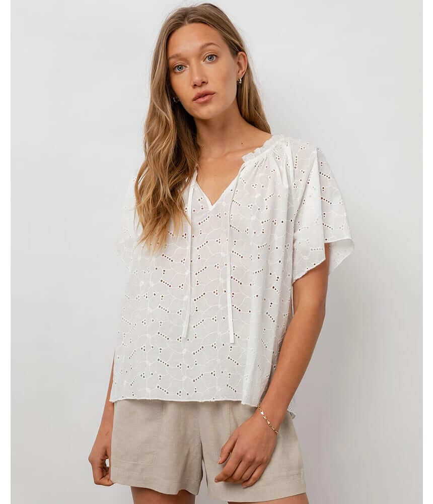 The Marisol top by Rails is a versatile, ultra lightweight piece that can be effortlessly styled up or down. Cut in a crisp white cotton with delicate eyelet embroidery, a V-neckline with soft shirring, neck ties and fluttering raglan sleeves. This pretty pull-on-and-go top features feminine detailing that looks fantastic with vintage denim and sandals.