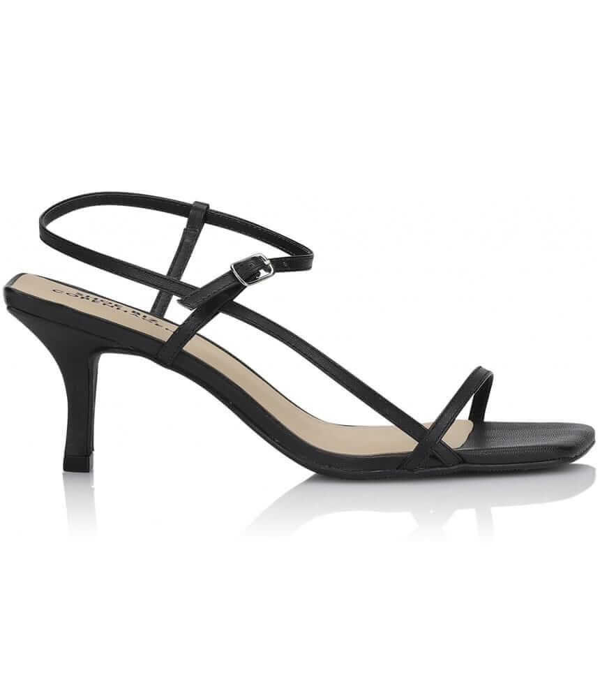 Ninis is a classic minimalist high-heeled calf leather sandal with square toe, on a thin heel with a narrow strap over the toes and around the ankle.