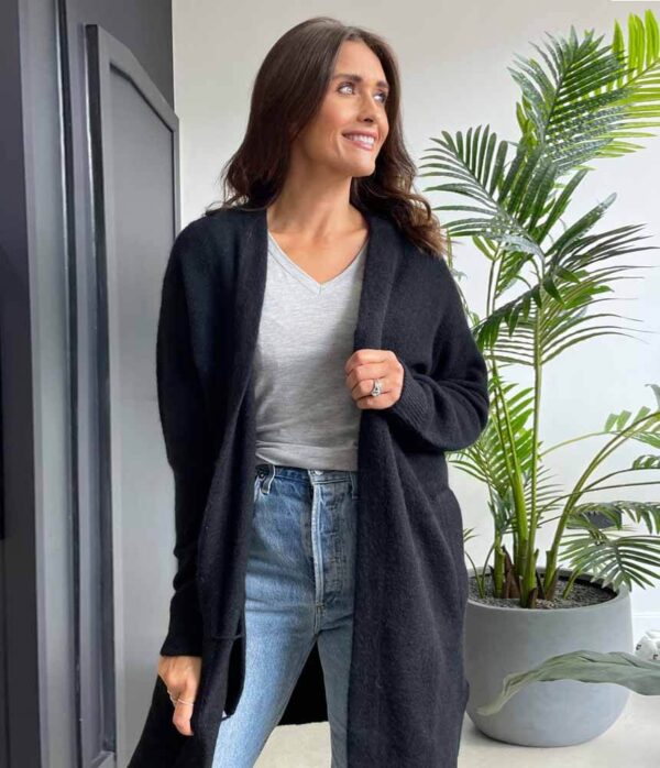 Nor is a long line cardigan by Samsoe Samsoe. Expertly knitted in an alpaca and merino wool yarn, chosen for it’s soft and fluffy look. Fastenings have been removed from this classic black piece to create an effortless, long knitted piece that is super stylish and easy to style.