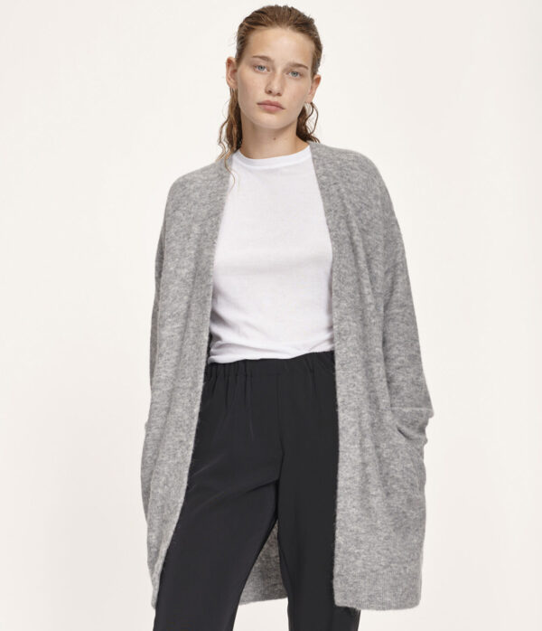 Nor is a long line cardigan by Samsoe Samsoe. Expertly knitted in an alpaca and merino wool yarn, chosen for it’s soft and fluffy look. Fastenings have been removed to create an effortless, long knitted piece that is super stylish and easy to style.