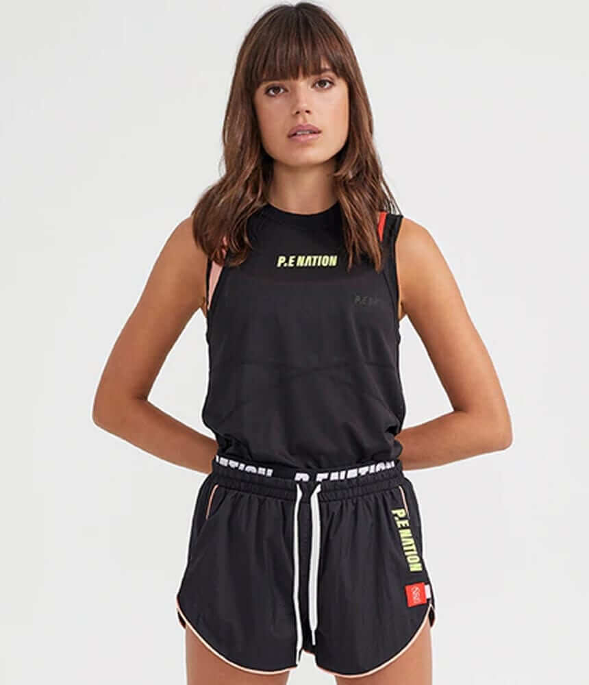 The Opponent Slim Tank in Black comes as part of the Together We Move Collection. This relaxed fit tank features a scoop neckline with racer back. It’s the perfect bold statement for your next workout session and makes a strong street-sport statement to work into your athleisure wardrobe. Featuring a wide neckline rib with internal P.E Nation printed logo elastic, P.E Nation flat rubber print centre front, and P.E Nation silicone badge and flag at the back. Cross over contrast cover-stitching give the tank fashion-forward sporty appeal. We like it worn with the Opponent Leggings.