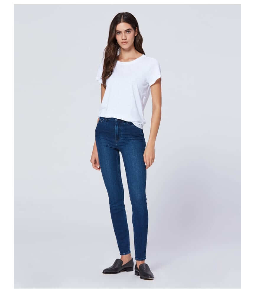 These flattering, high rise, ultra-skinny jeans by Paige Denim are made from a comfort stretch fabric with a soft feel. In a light to mid indigo wash with light whiskering, abrasion and hand sanding. Add a Bella Freud knit and a chunky boot and you are Autumn ready.