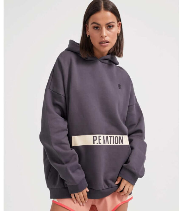 The Momentum Hoodie comes as part of the Work It Downtown Collection. Layer up in cool weather and between training sessions in this stylish hoodie. Designed to fit oversized with comfortable drop shoulder and cut from heavyweight organic cotton for supreme style on colder days. Featuring a generous pouch pocket and simple P.E Nation flat rubber print on front to offset at-once unexpected and signature all-sport graphics emblazoned on the back in a mixture of flat rubber print and raised embroidery for contrast and classic P.E attention to detail. Wear with the Momentum Legging from street to studio.