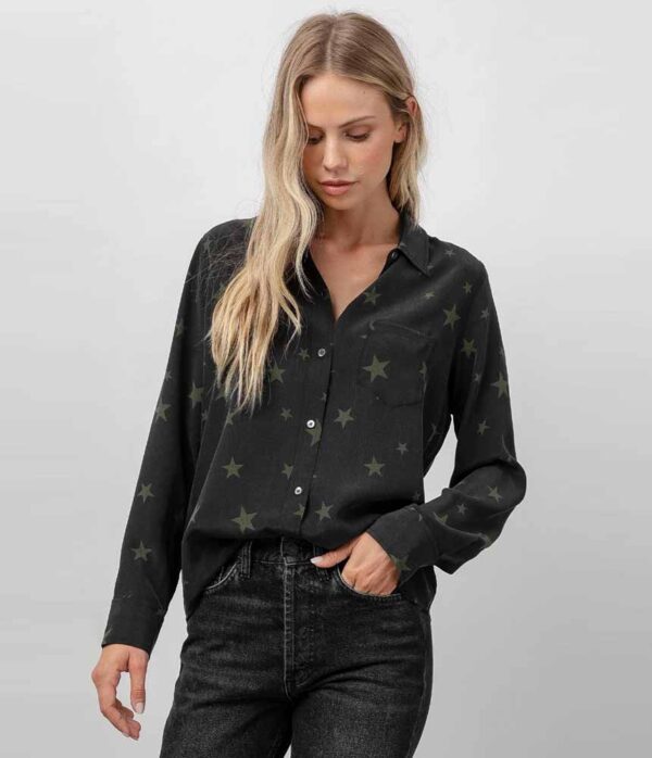 Meet Kate. She is a stunning washed silk, long sleeve tailored top featuring olive green stars in assorted sizes. This classic design is perfect for the luxe, elevated fabrication and creates a timelessly polished look. Simply add denim and a statement boot for an outfit that will take you anywhere.