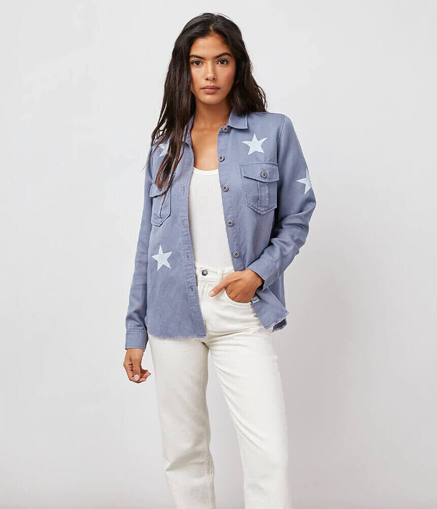 The Loren shirt jacket from Rails is a stand-out, featuring a distressed star print throughout, button-fastening pockets at chest, and a frayed raw hem. Cast in a soft Blue Granite, this style is a lightweight military inspired shirt jacket that can be worn open with your favourite tee or buttoned up. Style over a classic tee and pair with denim and box-fresh sneakers for a cool and casual day look.