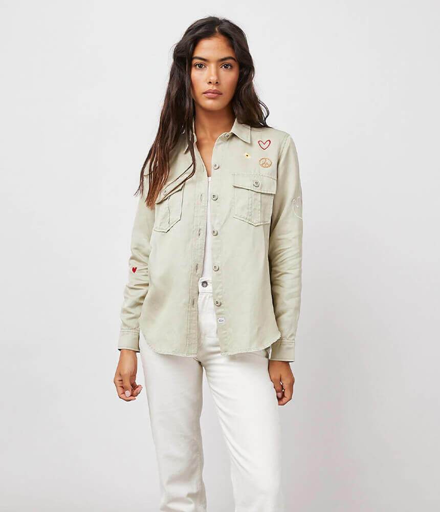 The Loren shirt jacket from Rails is decorated with whimsical vintage-inspired embroidery throughout. Cast in a soft sage, this style is a lightweight military inspired shirt jacket that can be worn open with your favourite tee or buttoned up. Style over a classic tee and pair with denim and box-fresh sneakers for a cool and casual day look.