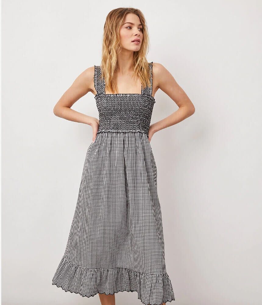 This flattering pull-on dress by Rails is made from a lightweight organic cotton-blend fabric for a soft feel and is decorated with all-over gingham print. Rumi features a square neckline, smocked bodice, smocked wide shoulder straps, and ruffled panel at hem. Clash prints and pair with Arizona Love sandals for a bold look and layer a distressed denim jacket over the shoulders.