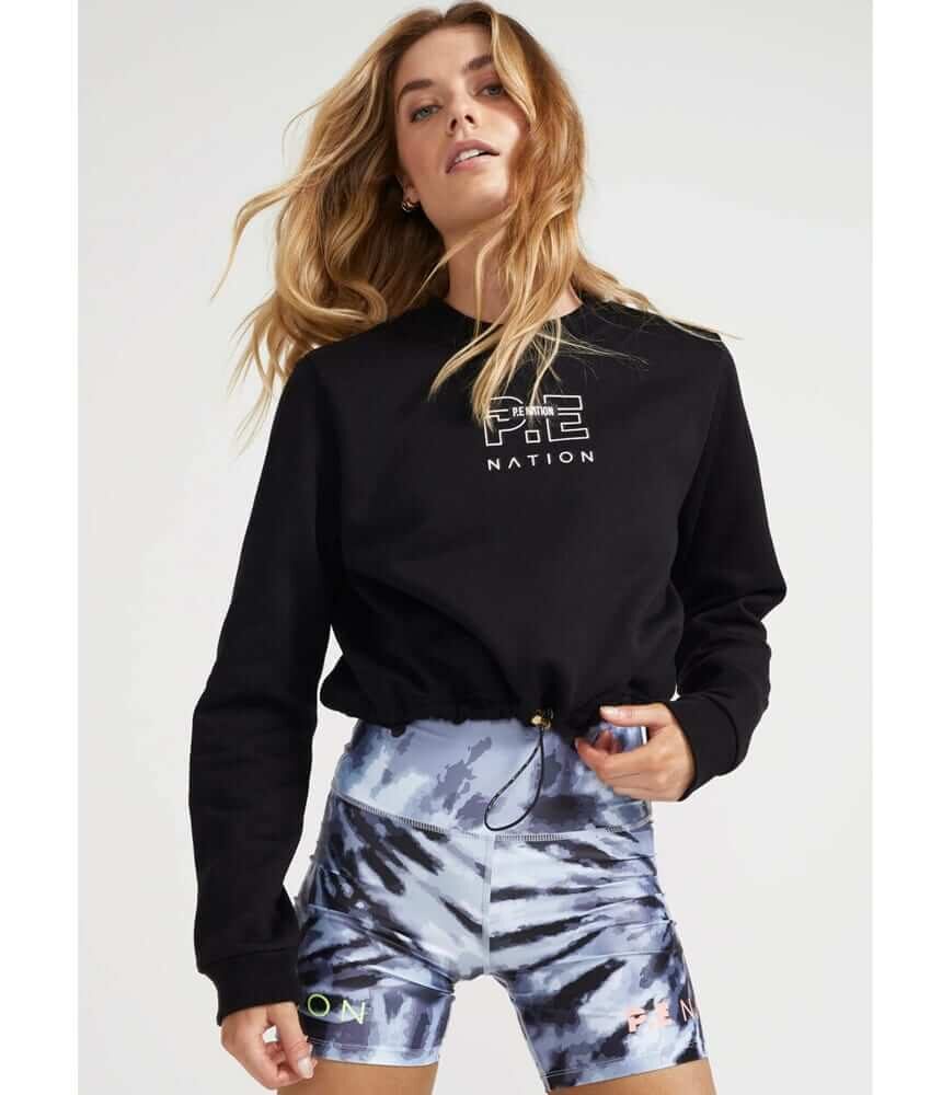 The Replay Sweat by P.E Nation returns as a part of their Do It Your Way Collection. A must-have cropped sporty sweatshirt in a classic black shade. Cut for a relaxed silhouette, offering a draw-cord toggle on the hemline for an adjustable and custom fit. Featuring a brushed fleece interior for extra warmth and comfort, and a P.E Nation print through the chest. Wear it loose or ruched to show off the cropped hemline.