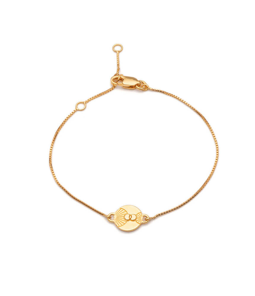 Part of Rachel Jackson’s Zodiac Art collection celebrating both our individual uniqueness and our connectivity to each other and the universe. This 22 carat gold plated sterling silver luminary art coin features the sun, the most powerful star in the universe, influencing the way we express ourselves and our overall energy. The coin is integrated into a gold box chain bracelet.