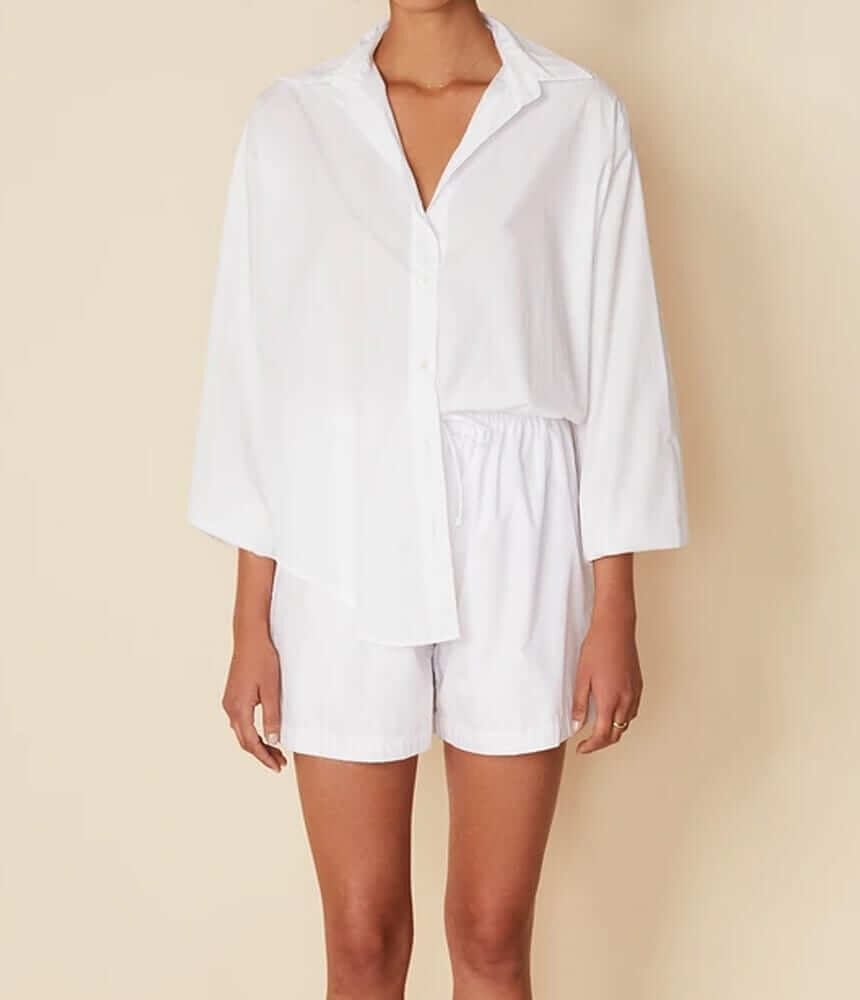 Versatile and understated, the Rylen Shirt is an essential piece for your wardrobe. Cut from a crisp, lightweight cotton poplin fabrication for breathability and comfort. Featuring centre front white button detailing, a pointed collar and elasticated cuffs to create a billowing, feminine effect. Wear it unbuttoned over your swimsuit or pair with the matching Sereno Shorts for an effortless look.