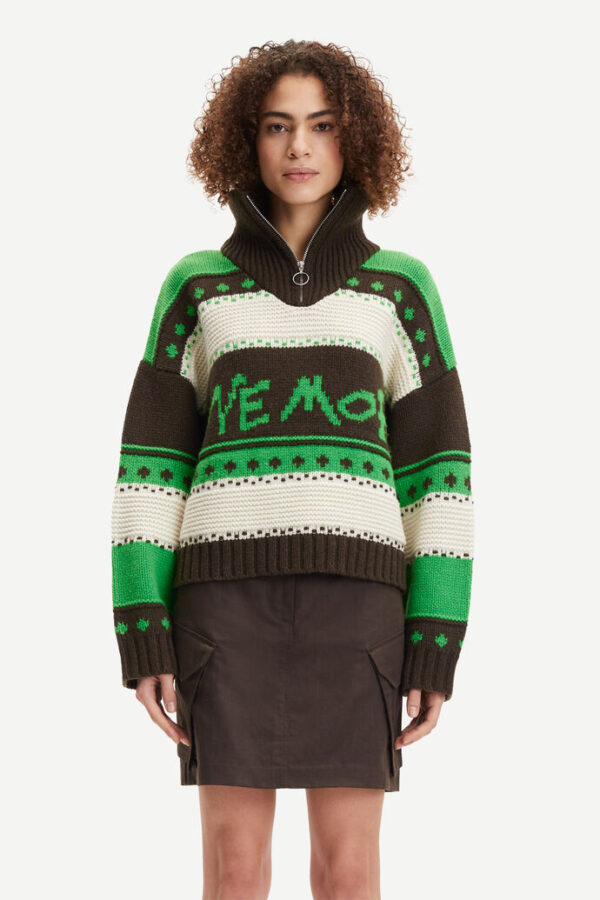 The Ekei turtleneck, zip up multi-colour knit from Scandi brand Samsoe Samsoe is a relaxed-fitting, patterned pullover with dropped shoulders and a boxy fit. This “LOVE MORE” slogan jumper is perfect for layering over a long sleeve tee pairing it with jeans and a co-ordinating beanie. Complete the look by adding a chunky statement boot for a winter ready outfit that is both cosy and super stylish.