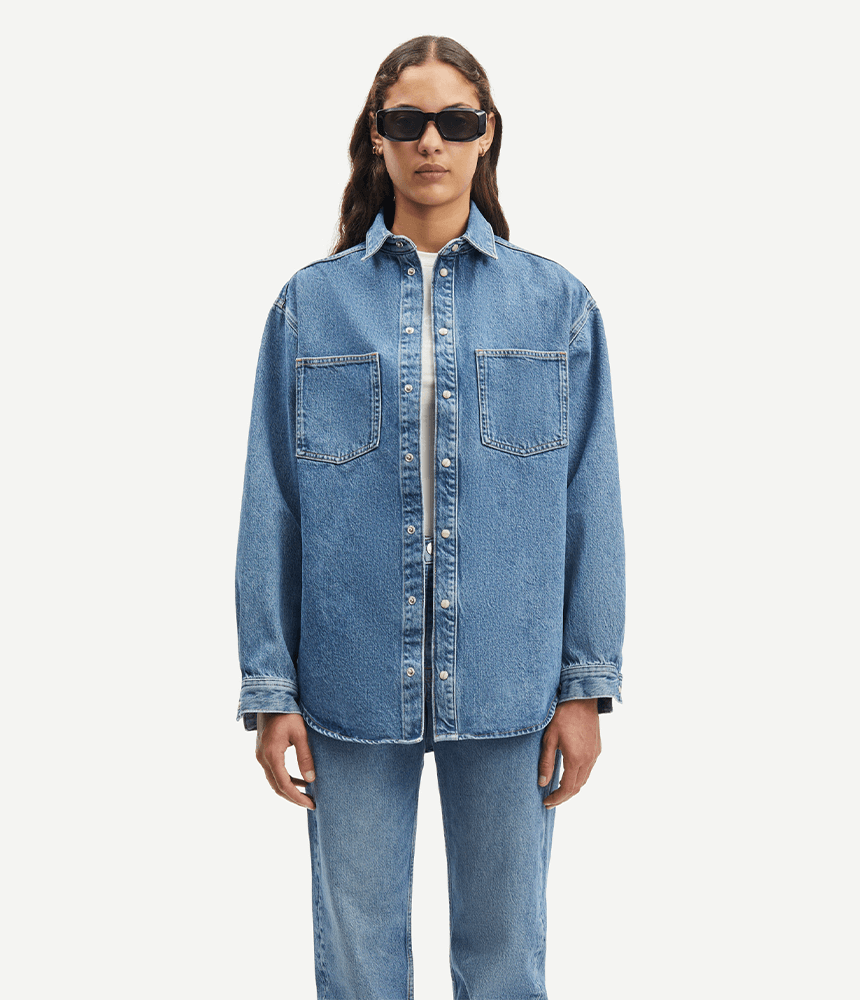 Relaxed fitting long sleeve denim shirt with a curved hem. Press button fastening center front and cuffs. Chest pockets, back neck yoke seam with pleats. 100% organic cotton denim fabric with a vintage stone wash.