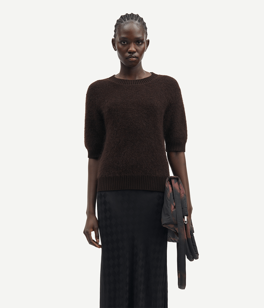 Short-sleeved sweater with a regular fit and slightly dropped shoulders. Rib-knitted crewneck, cuffs, and hem. Main material made from an elastic blend with mohair and wool.