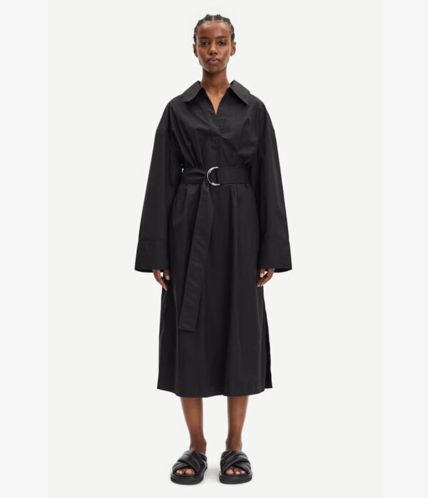 The Malene dress from Samsoe Samsoe is a loose fitting belted dress and is made from 100% organic cotton. Detailed with an open neck placket with wide collar, side seam hem slits and dropped shoulders giving an exaggerated, relaxed style. Add some jewellery and heels to dress up this look or pair with sliders for a relaxed lunch style. .