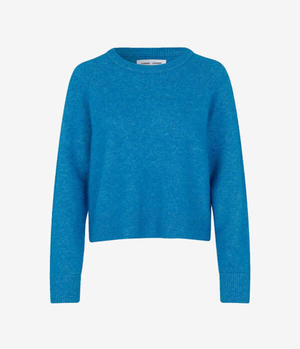 This knit by Samsoe Samsoe is a boxy fit jumper made with a soft and fluffy alpaca and merino wool blend yarn and cast in bold Ibiza Blue. The Nor jumper features a wide round neck, raglan sleeves, ribbed-knit trims and is slightly cropped. Style with denim jeans and leather sneakers for a casual brunch and shopping day.