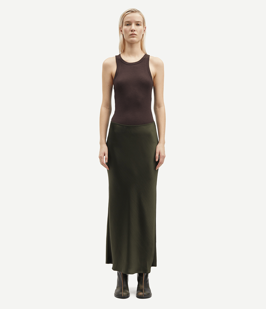 The Samsoe Samsoe Saaggneta Long Skirt. Made with high-quality materials, this skirt features a stunning design that will turn heads. Its flattering silhouette, cut on the bias, adds a touch of sophistication to any outfit. Dress up with heels for a night out or down with a sweaters and trainers for an elevated, every day look. Take your normal size (size small = UK10).