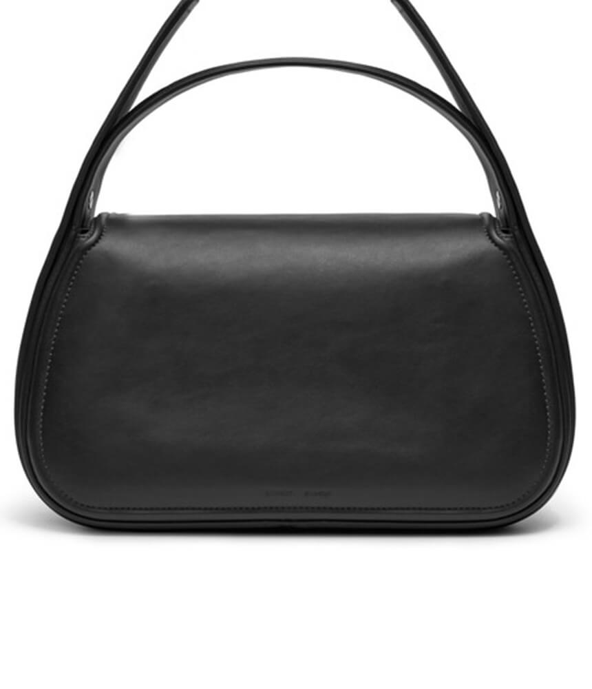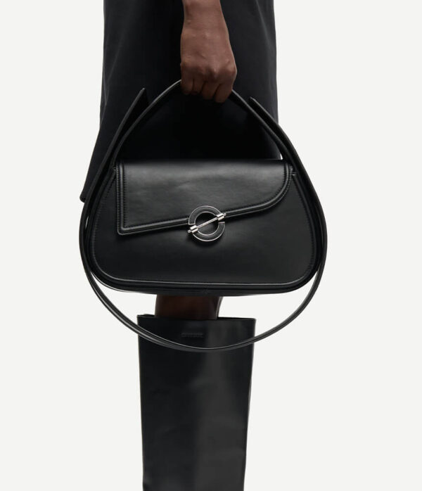 Polished leather shoulder bag with a handle and adjustable, detachable shoulder strap. Metal closure on the front in the shape of the iconic ø. Logo branded patch pocket on the inside. Silver-toned hardware. Main material made from cow leather.