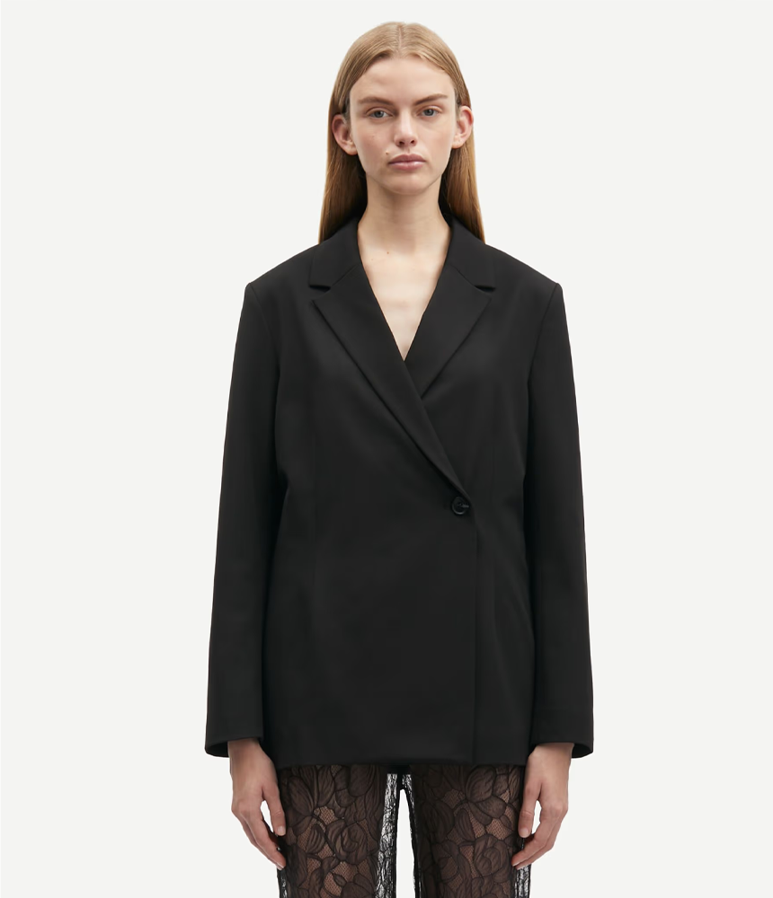 Blazer with a loose fit and shoulder pads. Single button and self-tie wrap closure on the front. V-neck. Welt pockets on the front and welt pocket on the inside. Belt loops. High vent at the back. Fully lined. Main material made from an elastic blend with recycled polyester.