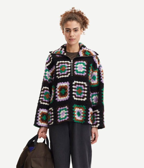 The Tess Overshirt by Scandi brand Samsoe Samsoe is a relaxed-fitting, patterned overshirt with dropped shoulders and a boxy fit. This crochet look overshirt is perfect for layering over a chunky knit with a beanie and chunky statement boot for a winter ready outfit that is both cosy and super stylish.