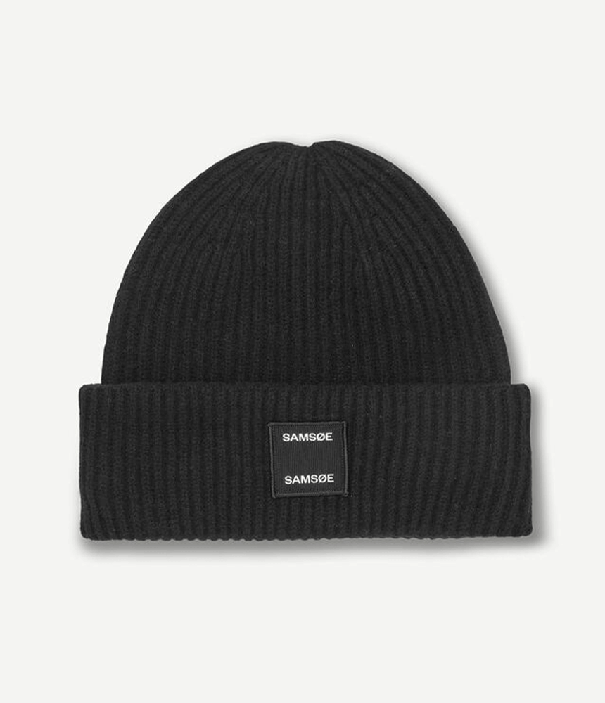 Knitted beanie hat with turn back hem. Knitted rib stitch, fully fashioned shaping. Samsøe Samsøe logo label on the front. Medium gauge, 100% wool yarn. This product is RWS certified. RWS ensures that animal welfare and land management requirements are met, from farm to final product.