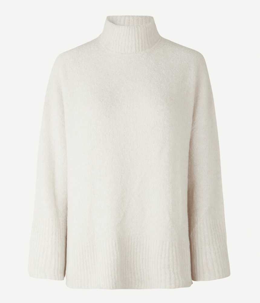 Relaxed fitting long length turtleneck jumper with exaggerated dropped shoulders and wide long sleeves. Rib trimmed collar, cuffs and hem, fully fashioned shoulder. Fuzzy textured stretch boucle yarn, alpaca, nylon and Elastane blend, RWS certified.