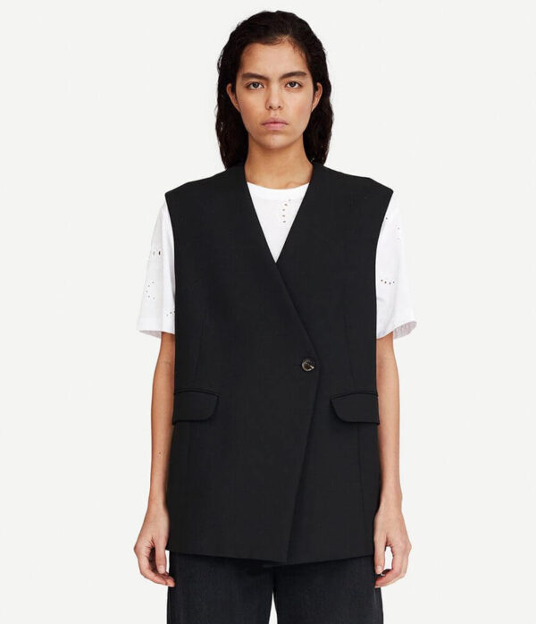 The gorgeous Erika Vest by Samsoe Samsoe is expertly crafted in a recycled polyester and EcoVero viscose blended fabric to create a soft handle garment that is also kind to the environment. Cut in a regular fit, this sleeveless blazer features a simple V-neckline with button fastening, flapped front pockets and also has a versatile inside pocket. Style with faux leather leggings and a slogan tee for an easy to wear but edgy vibe.