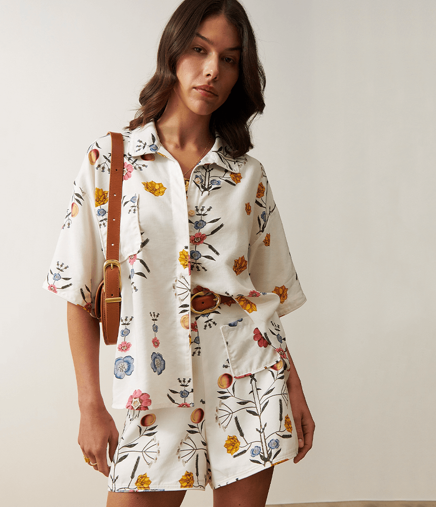 The Celesta’s relaxed yet flattering fit pairs perfectly with black, white or denim bottoms for an elevated casual look. Team it with the Sastria short from Sancia in Dahlia floral, or tuck it into high-waisted trousers for the office, or leave it untucked over your favourite jeans for weekend brunch. The vibrant dahlia floral motif adds a touch of femininity that can be played up with accessories or toned down for more minimalist vibes.