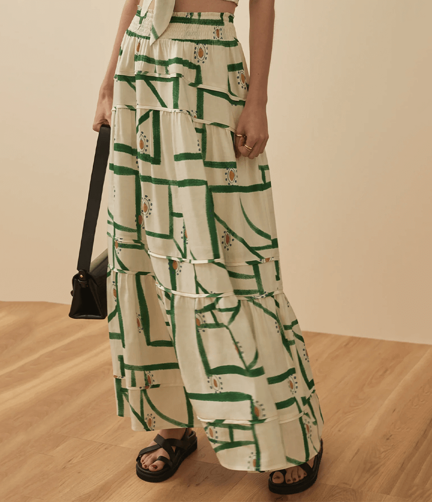 The Elodie Skirt is made from a luxurious linen blend that lends to the fluidity of the skirt. The waistband is comprised of a shirred panel that makes it an easy fit and also allows for the perfect amount of texture and volume. The tiers fall beautifully and are accentuated with a small binding in the main fabric. Wear it back with the Evangeline Top for the complete look.