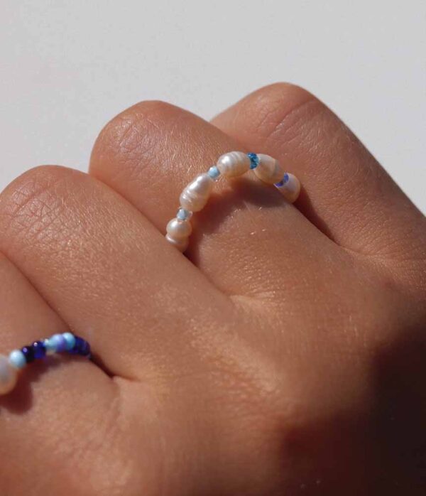 Inspired by the clear blue seas of the Caribbean. This gorgeous ring is expertly handcrafted using beautiful freshwater pearls punctuated with blue glass beads. Pair with the matching Bahama bracelet for a winning combination.