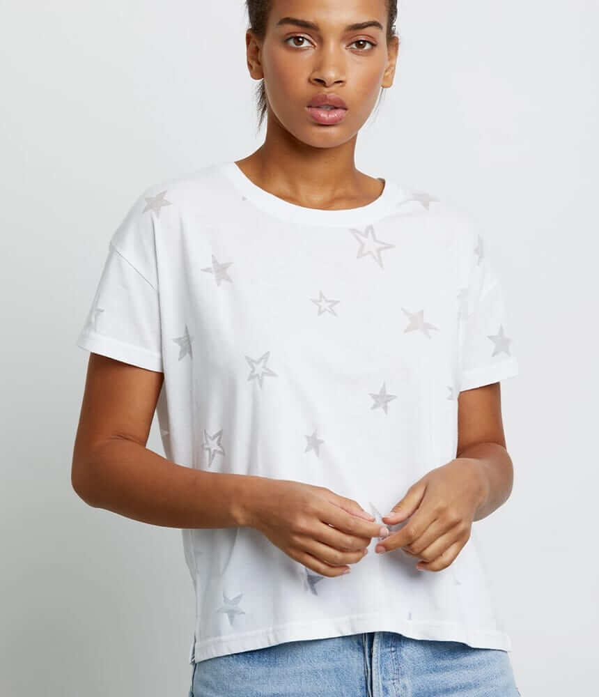 Elevate your off-duty look with this cute tee from Rails. Crafted in a lightweight jersey fabrication with short sleeves and a simple neckline. The fabric used to make this piece has a burnout star design throughout. Simply add jeans and a pair of box fresh sneakers for a winning combination.