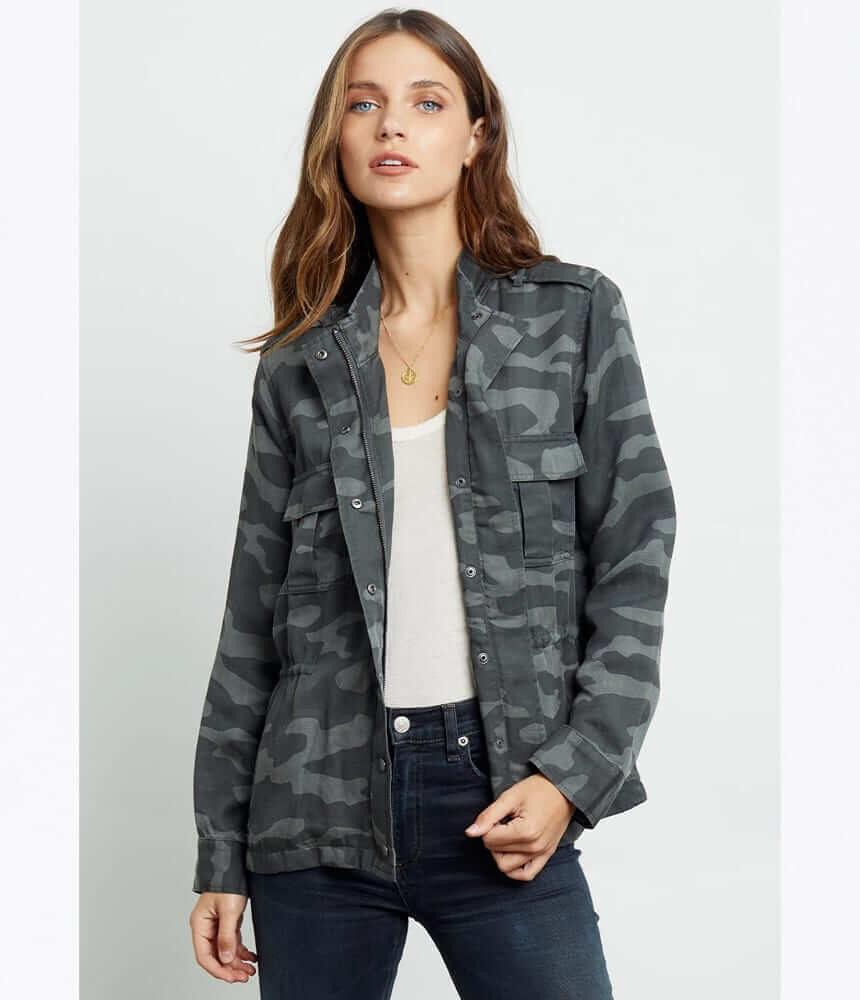 The Trey by Rails is a lightweight, long sleeve, funnel neck jacket featuring authentic utility details with dark charcoal grey camouflage print throughout, The heavy tencel stunner features a zipped front closure, chest patch pockets, and inner drawstring waist that can be pulled for a flattering cinched look or left open for a more relaxed fit.